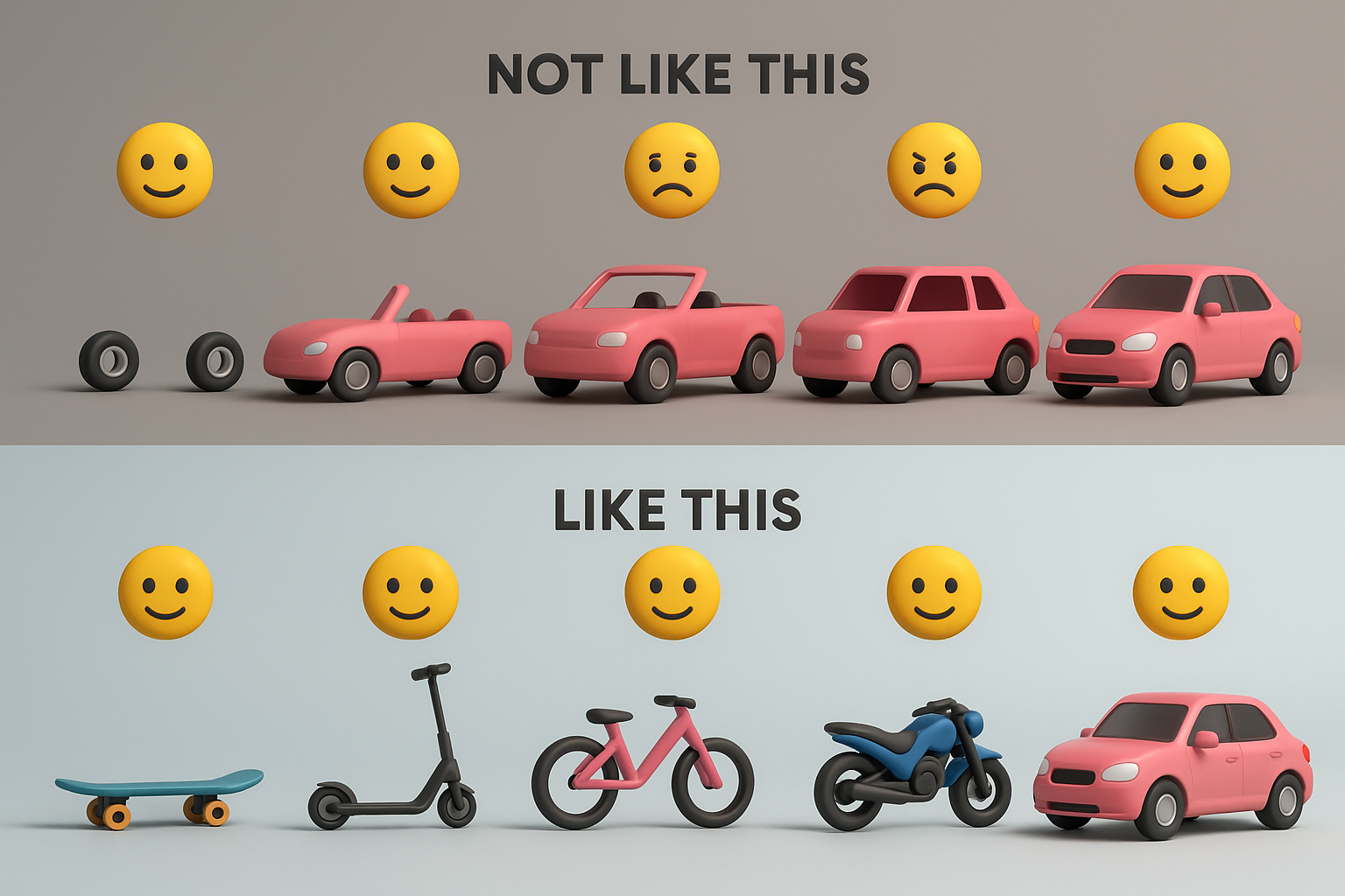 Ein echtes MVP löst von Tag eins ein Problem. Vielleicht nicht perfekt, vielleicht nicht in der Endform, aber es bringt dich ins Rollen. Ob Skateboard, Roller oder Fahrrad: Jeder Schritt funktioniert, jeder Schritt liefert Wert.